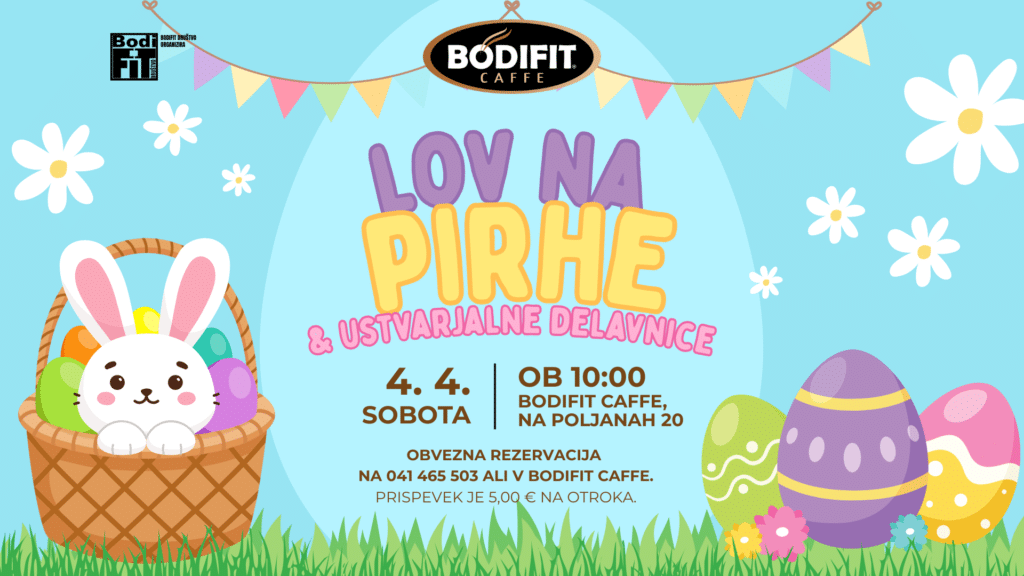 V sproščenem vzdušju in pod vodstvom mentorjev bodo otroci izdelovali unikatne velikonočne pirhe ter praznično dekoracijo, hkrati pa se bodo podali na napet lov za skritimi pirhi po prostorih BODIFIT-a. Vsak mali umetnik in lovec na zaklad bo za svoj trud prejel sladko nagrado, izdelke pa bodo otroci lahko odnesli domov za spomin. Medtem ko se bodo najmlajši zabavali, si starši lahko privoščite sproščeno kavo v prijetnem ambientu našega caffeja.